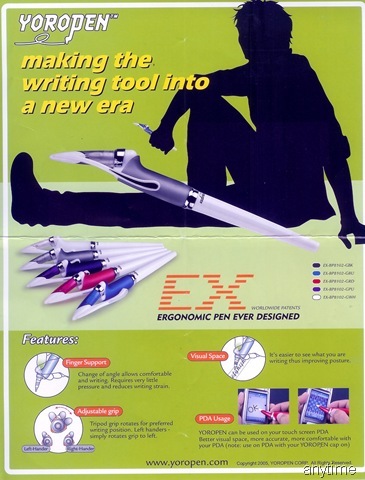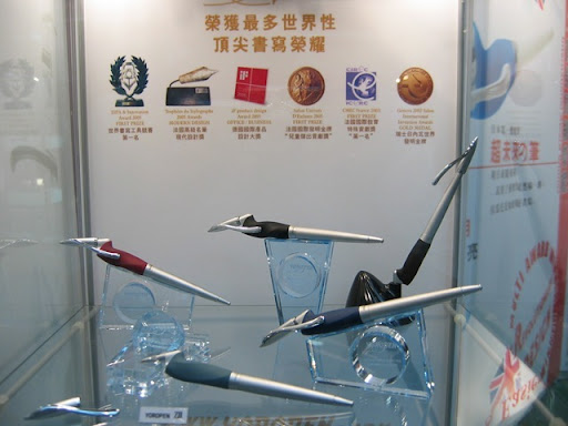 Yoropen 為一經過特殊設計的筆,主要為針對小孩子近視及身體姿勢不良所開發設計出來的,在展場中並提供鉛筆原子筆試寫,試用了一下,覺得還算不錯使用,也許是用不習慣,字還是寫的不是很好看,也沒輕鬆到那裡。現場並有銷售,印象中鉛筆、原子筆一隻350元,金屬筆一隻則要2000~2500元,並附替換筆蕊。